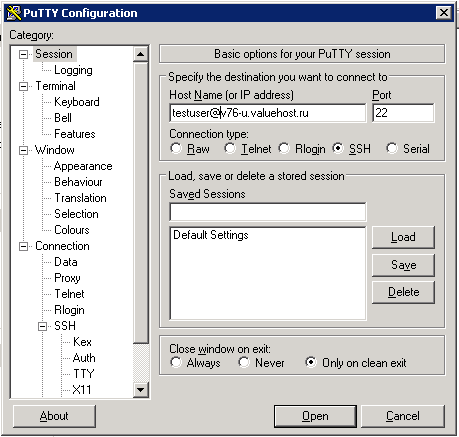Для обегчения работы целесообразно сразу указать имя пользователя для подключения (SSH-логин), а также сохранить сделанные настройки. SSH-логин указывается перед именем хоста и отделяется от него символом "@". В нашем примере это будет выглядеть так: